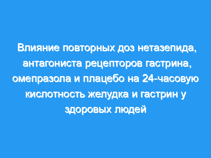 Для первого введения повторных пероральных доз нетазепида здоровым субъектам для оценки безопасности, переносимости, фармакокинетики и влияния на 24-часовой рН желудка и гастрин плазмы. Метод: Мы провели два рандомизированных, двойных слепых, параллельных групповых исследования. В первом сравнивались нетазепид по 25 и 100 мг 12 раз в час, омепразол по 20 мг один раз в день и плацебо в течение 7 дней. Только на 7-й день мы измерили рН и определили уровень гастрина в плазме. Во втором исследовании сравнивали нетазепид в дозе 5, 10 и 25 мг и плацебо один раз в день в течение 14 дней. Мы измеряли рН на 1, 7 и 14-й дни и анализировали гастрин плазмы на 1 и 14-й дни. Мы сравнили методы лечения по времени рН желудка ≥ 4 в течение 0-4, 4-9, 9-13 и 13-24 ч после утренней дозы и по гастрину плазмы. P <, 0,05 был значимым.