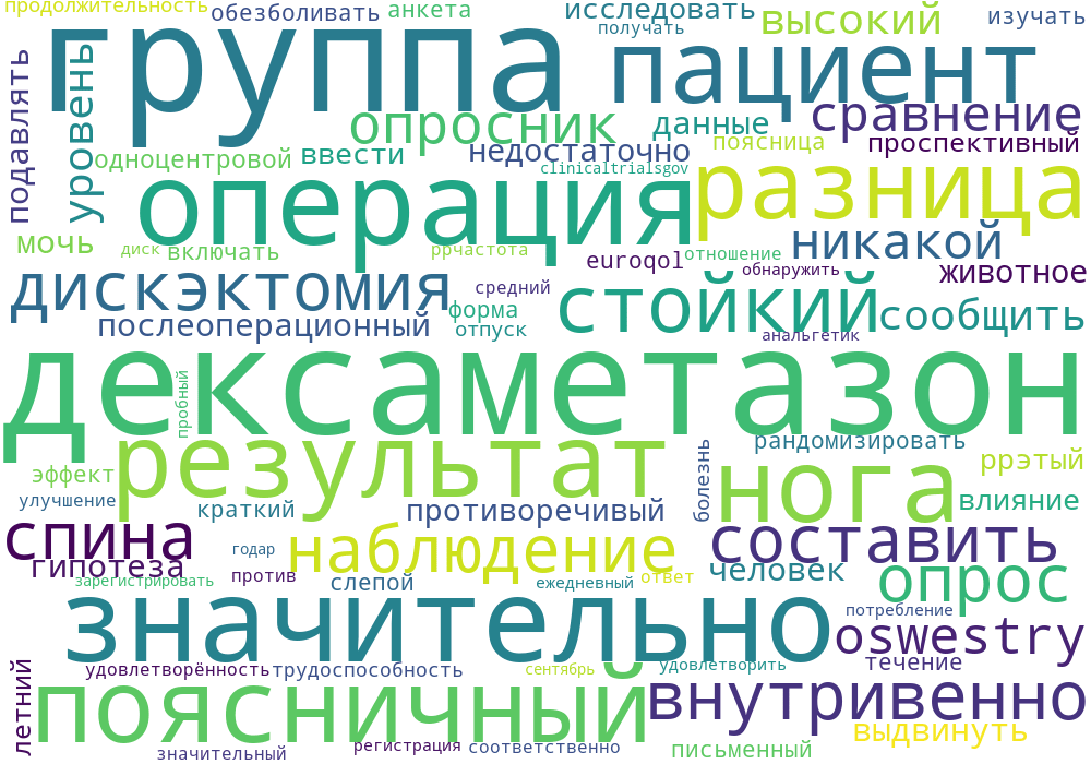 Частота ответа составила 71% (55 пациентов) в группе дексаметазона, 58% (44 пациента) в группе плацебо. Боль в ногах (ВАШ) была значительно ниже в группе плацебо по сравнению с группой дексаметазона: 17 (95% ДИ 10-26) против 26 (95% ДИ 19-33) мм соответственно (средняя разница 9 мм (95% ДИ от -1 до 0), (Р = 0,03). Никакой разницы в отношении боли в спине. Группа, получавшая плацебо, сообщила о значительном улучшении боли в ногах и была значительно более удовлетворена результатом операции. Пациенты в группе дексаметазона сообщили о значительно более высоких уровнях боли в опросниках EQ-5D и Oswestry. Никакой разницы в опросе SF-36 или ежедневном потреблении анальгетиков.