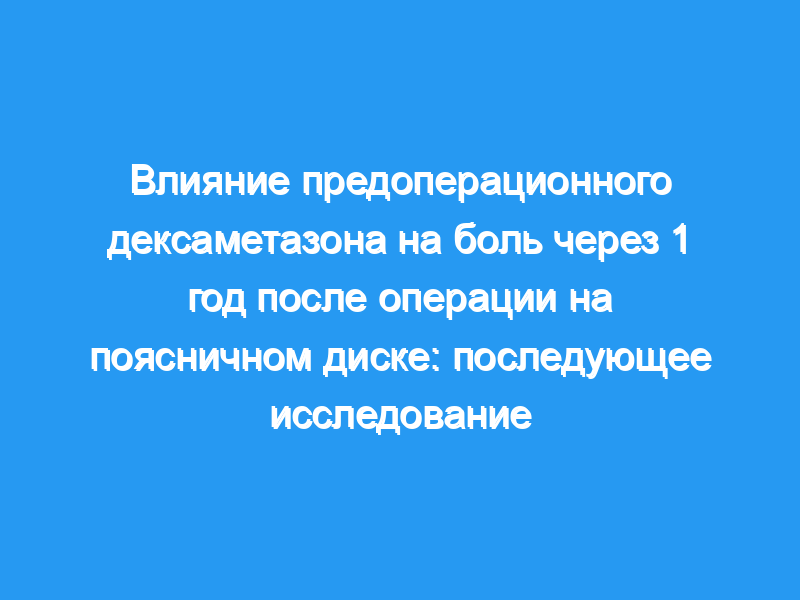 Это проспективное 1-летнее наблюдение за одноцентровым рандомизированным и слепым исследованием, изучающим обезболивающий эффект дексаметазона в дозе 16 мг внутривенно или плацебо после поясничной дискэктомии. В течение одного года наблюдения была составлена письменная анкета, включающая боль в спине и ногах (ВАШ 0-100 мм), Краткий опрос формы 36 (SF-36), EuroQol 5D (EQ-5D), опросник боли в пояснице OSWESTRY, продолжительность отпуска по болезни, трудоспособность, удовлетворенность результатом операции.