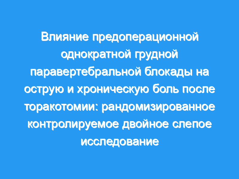 Пациенты, перенесшие торакотомию, часто испытывают острую боль и хроническую боль после торакотомии (CPTP). Существует несколько статей, касающихся исследований влияния предоперационной однократной грудной паравертебральной блокады (PSTPVB) на острую боль и CPTP. Мы проверили гипотезу о том, что добавление PSTPVB к внутривенной (IV) контролируемой пациентом анальгезии (PCA) уменьшит показатели острой боли и уменьшит частоту и интенсивность CPTP.