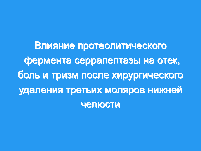 Целью данного исследования было изучение способности серрапептазы уменьшать послеоперационный отек, боль и тризм после операции на третьем моляре.Двадцать четыре здоровых человека с симметрично пораженными третьими молярами нижней челюсти подверглись хирургическому удалению в ходе проспективного внутрииндивидуального рандомизированного двойного слепого перекрестного исследования.
