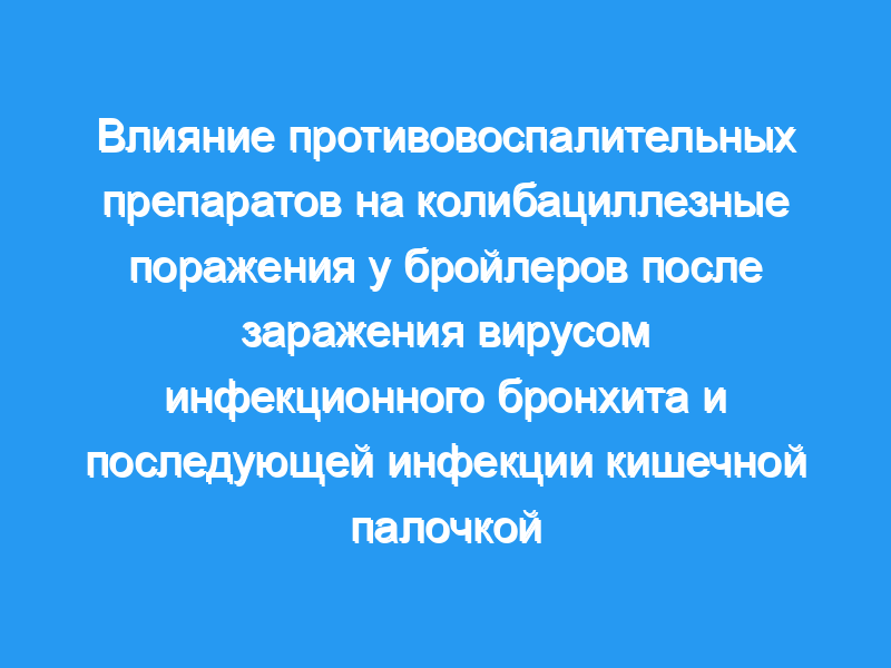 Оценить влияние противовоспалительных препаратов на поражения, вызванные колибациллезом. Животные и методы: Пять групп суточных бройлеров по 15 птиц в каждой были помещены в изоляторы и в возрасте 29 дней были привиты штаммом вируса инфекционного бронхита M41 окуло-назальным и интратрахеальным путями (10(5.4) EID(50) (доза заражения яиц 50)/бройлера) и в 33-дневном возрасте штаммом Escherichia coli 506 по пути IT (10 (7,6) колониеобразующих единиц/бройлер). Бройлеров четырех групп с 28-го по 39-й день включительно ежедневно перорально обрабатывали карбазалатом кальция (4 × 12,5 мг), мелоксикамом (2 × 0,5 мг), ацетаминофеном (4 × 2,5 мг) или дексаметазоном (1 × 1,0 мг). Пятая группа получала плацебо-препараты. В возрасте 40 дней эксперимент был завершен, и при посмертном осмотре были оценены колибациллезные поражения.