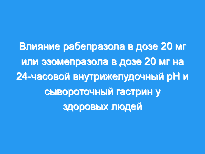 Сравнить антисекреторные эффекты рабепразола и эзомепразола в открытом рандомизированном двустороннем перекрестном клиническом фармакологическом исследовании. Двадцать четыре здоровых субъекта (14 мужчин, 10 женщин, средний возраст 26,8 года) получали рабепразол в дозе 20 мг или эзомепразол в дозе 20 мг ежедневно в течение 1-5 дней с 14-дневным «вымыванием». Внутрижелудочный рН непрерывно регистрировали и измеряли уровень гастрина в сыворотке крови в дни 0, 1 и 5.