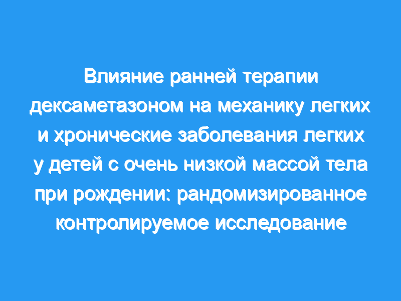 Было проведено проспективное рандомизированное исследование. В исследование были включены сорок три пациента (масса тела при рождении от 600 до 1500 г, гестационный возраст от 24 до 32 недель), которых не удалось отлучить от аппарата искусственного дыхания в возрасте от 7 до 14 дней, 23 ребенка получили 7-дневный курс дексаметазона (0,5 мг/кг/сут внутривенно в течение 3 дней, 0,25 мг/кг/сут в течение 3 дней и 0,1 мг/кг/сут в течение 1 дня), и 20 пациентов были в контрольной группе. При аналогичном среднем давлении в дыхательных путях (MAP) и фракционной концентрации вдыхаемого кислорода (FiO2) механику дыхательной системы измеряли до и на 2, 5 и 7-й дни исследования. Регистрировали давление в дыхательных путях, расход и дыхательный объем (VT) и анализировали только механические вдохи. Респираторная комплаентность (Crs) и респираторное сопротивление (Rrs) были рассчитаны с помощью двухфакторного анализа наименьших квадратов. Восемьдесят три процента младенцев в группе дексаметазона и 90% в контрольной группе получали сурфактант в первые 24 часа жизни. В группе дексаметазона наблюдалось значительное увеличение Crs и VT по сравнению с контрольной группой (P <, 0,001). Никаких существенных изменений в Rrs не наблюдалось. Терапия дексаметазоном значительно снизила FiO2 и MAP P <, 0,001) и способствовала успешному отлучению от искусственной вентиляции легких. В дополнение к более короткой продолжительности искусственной вентиляции легких (P <, 0,01), частота CLD (FiO2 >, 0,21 на 36 неделе скорректированного гестационного возраста, изменения на рентгенограмме грудной клетки) была значительно снижена в группе дексаметазона (P <, 0,01). За исключением кратковременного повышения артериального давления и уровня глюкозы в сыворотке крови, не было выявлено существенных различий в частоте инфицирования, внутрижелудочковых кровоизлияний или ретинопатии недоношенных. Тринадцать пациентов в контрольной группе получали дексаметазон в более позднем возрасте.