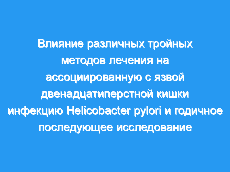 Оценить влияние различных тройных методов лечения на заживление язвы двенадцатиперстной кишки, связанной с инфекцией Helicobacter pylori (Hp), эрадикацию Hp и рецидив язвы. Способ: 248 пациентов с Нр-ассоциированной активной язвой двенадцатиперстной кишки, подтвержденной эндоскопией, 193 мужчины и 55 женщин, были рандомизированы для получения ОАК (250): омепразол (0,20 мг бид) + амоксициллин (1000 мг бид) + кларитромицин (250 мг бид) в течение 1 недели (группа А1) или 2 недель (группа А2), ОАК (500): омепразол (0,20 мг бид) + амоксициллин (1000 мг бид) + кларитромицин (500 мг бид), в течение 1 недели (группа В1) или 2 недель (группа В2), или ОАМ: омепразол (0,20 мг бид) + амоксициллин (1000 мг бид) + метронидазол (400 мг бид) в течение 1 недели (группа С1) или 2 недель (группа С2) соответственно. Эндоскопию и биопсию проводили не менее чем через 4 недели после окончания терапии для проведения гистологического исследования unde5rgo. Был проведен экспресс-тест на уреазу. Эндоскопическое и гистологическое исследование, а также экспресс-тест на уреазу были проведены дважды пациентам с язвой, зажившей через 6 месяцев и через год, чтобы наблюдать частоту рецидивов.