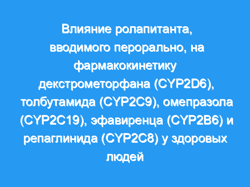 Ролапитант — антагонист рецептора нейрокинина-1, назначаемый в комбинации с другими противорвотными средствами у взрослых для профилактики отсроченной тошноты и рвоты, вызванных химиотерапией. Мы оценили влияние ролапитанта перорально на фармакокинетику зондовых субстратов для цитохрома Р450 (CYP) 2D6 (декстрометорфан), 2C9 (толбутамид), 2C19 (омепразол), 2B6 (эфавиренц) и 2C8 (репаглинид) у здоровых людей.