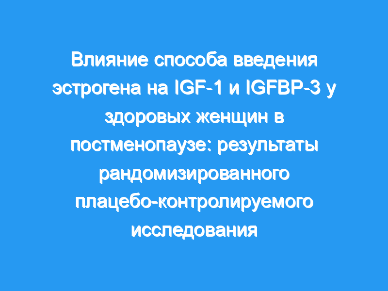 Эстрогены могут модулировать действие или секрецию гормона роста. Предыдущие исследования у женщин в постменопаузе показали дифференциальное влияние трансдермального 17-бета-эстрадиола и перорального этинилэстрадиола на концентрацию гормона роста и ИФР-1. Этот вторичный анализ, основанный на крупном рандомизированном исследовании, был направлен на оценку влияния способа введения 17 бета-эстрадиола в комбинированной заместительной гормональной терапии с прогестероном на уровни IGF-1 и IGFBP-3. Дизайн: IGF-1 и IGFBP-3 были оценены в рандомизированном исследовании 196 здоровых женщин в постменопаузе, которые были случайным образом распределены для непрерывного приема либо 1 мг 17-бета-эстрадиола перорально в сочетании с ежедневным приемом 100 мг прогестерона (группа 1, n = 63), либо 50 мкг прогестерона. 17 бета-эстрадиол трансдермально в сочетании с ежедневным приемом 100 мг прогестерона (группа 2, n = 68) или тройного фиктивного плацебо (группа 3, n = 65) в течение 6 месяцев. Уровни IGF1 и IGFBP-3 были доступны для 133 женщин.