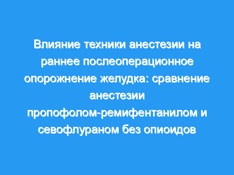Не было существенной разницы в раннем послеоперационном опорожнении желудка между ингаляционной анестезией севофлураном и общей внутривенной анестезией пропофолом-ремифентанилом. В обеих группах наблюдалась задержка опорожнения желудка, и вариабельность опорожнения желудка была высокой. Периоперационные факторы, отличные от техники анестезии, могут оказывать большее влияние на опорожнение желудка.