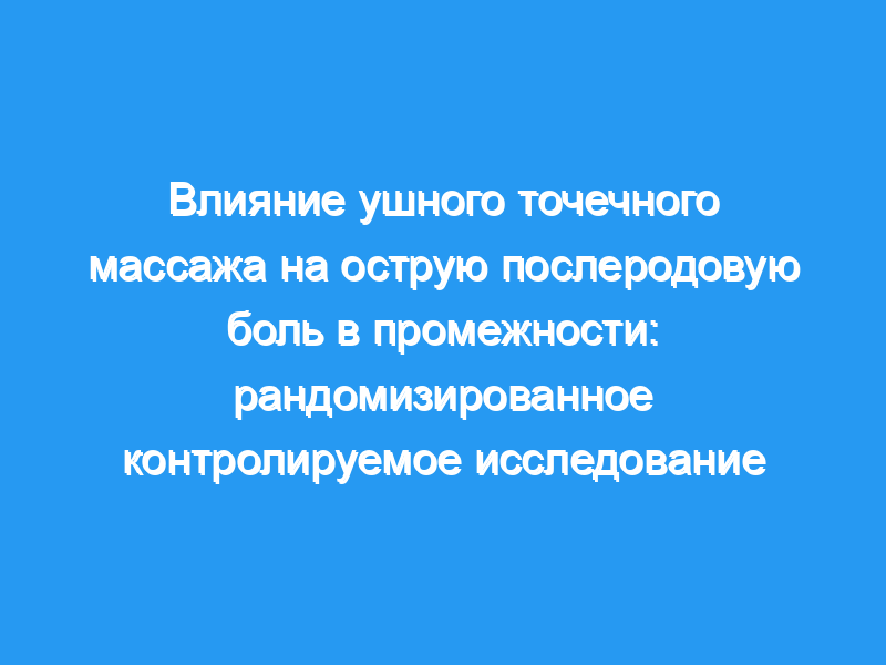 Боль в промежности является распространенной проблемой в послеродовой период, и для облегчения боли использовались различные методы лечения. Сообщалось, что точечный массаж ушей может принести пользу в облегчении острой послеродовой боли в промежности. Дизайн: Это исследование было разработано как проспективное рандомизированное контролируемое исследование.
