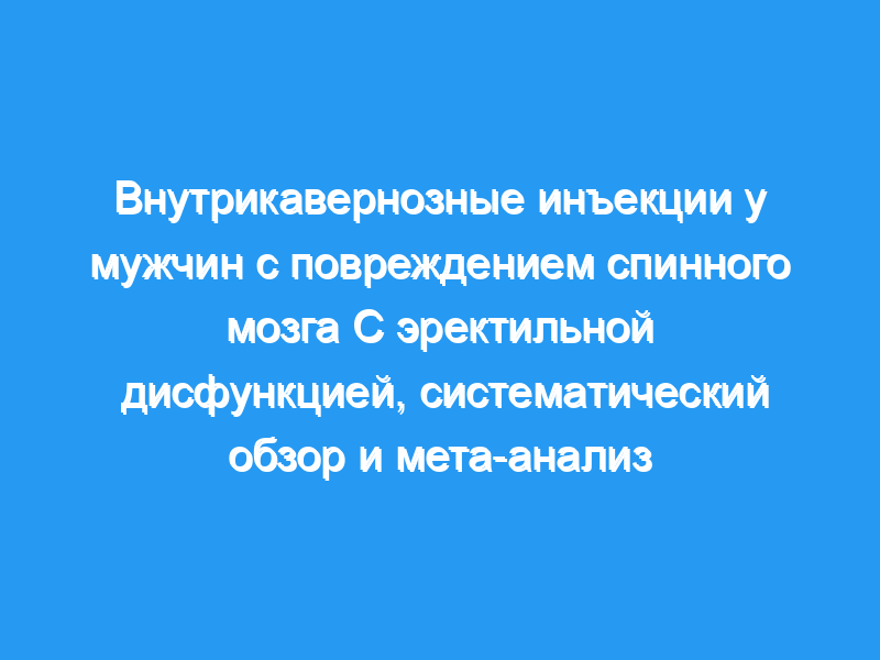 Систематический обзор литературы был проведен с использованием баз данных PubMed-Medline, Embase, EBSCO, Web of Science и Cochrane Library. Поиск литературы был ограничен статьями, опубликованными на английском, французском и испанском языках до ноября 2014 года, с использованием ключевых слов алпростадил, папаверин, моксисилит, альфа-блокатор, фентоламин, внутрикавернозная инъекция, травмы спинного мозга, параплегия, квадриплегия и эректильная дисфункция. Были включены исследования с участием пациентов с ТСМ и эректильной дисфункцией, получавших ИКИ алпростадила, папаверина и α-адреноблокаторов, включая ретроспективные и проспективные когорты, популяционные исследования и рандомизированные контролируемые исследования. Основной показатель результата: Общая частота ответов на ICI по поводу эректильной дисфункции у пациентов с ТСМ.