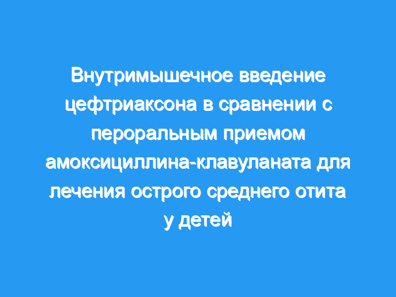 Двести пятнадцать детей в возрасте от 4 месяцев до 6 лет с острым средним отитом (ООМ) были рандомизированы для лечения путем однократной внутримышечной инъекции цефтриаксона в дозе 50 мг/кг со второй дозой в случае неудовлетворительного ответа через 48 ч или рецидива в анамнезе. АОМ (109 пациентов) или амоксициллина клавуланата в дозе 12,5 мг в сутки (106 пациентов). Частота неудач была аналогичной у детей, получавших цефтриаксон и амоксициллина клавуланат, 4,6% и 4,7% соответственно (стандартная ошибка для межгрупповых различий -2,87%, 95% доверительный интервал -5,62% -5,87%). Не было обнаружено существенных различий между группами в динамике разрешения острой симптоматики, результатах отоскопии, частоте рецидивов через 30 дней или тимпанографических свидетельствах выпота из среднего уха при плановых посещениях на 30, 60 и 90 дни. Рецидив АОМ между 31-м и 90-м днями наблюдался значительно у большего числа детей, получавших амоксициллин клавуланат, чем цефтриаксон — 25 из 84 (29,4%) против 11 из 81 (13,6%) (Р = 0,012).