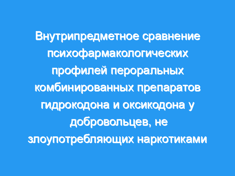 Двадцать добровольцев, не злоупотребляющих наркотиками, приняли участие в перекрестном рандомизированном двойном слепом исследовании, в котором они получали: плацебо, 975 мг ацетаминофена (АЦЕТАТА), 10 мг оксикодона (ОКСИ)/487 мг АЦЕТАТА, 20 мг ОКСИ/975 мг АЦЕТАТА, 15 мг гидрокодона (HYD)/487 мг АЦЕТАТА и 30 мг гидрокодона/975 мг АЦЕТАТА. Дозы OXY и HYD были выбраны таким образом, чтобы приравнять препараты к объективному показателю опиатного эффекта: миозу. Зависимыми показателями были субъективные, психомоторные/когнитивные, подкрепляющие и физиологические эффекты, а также оценки относительной потенции.