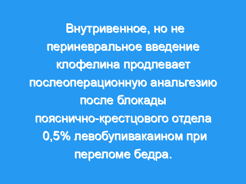 Не было существенных различий между группами в отношении послеоперационных побочных эффектов (брадикардия, гипотензия, седативный эффект и тошнота). Мы пришли к выводу, что внутривенный, но не периневральный клофелин (1 мкг/кг) продлевает обезболивание после ПХБ, не увеличивая частоту побочных эффектов.