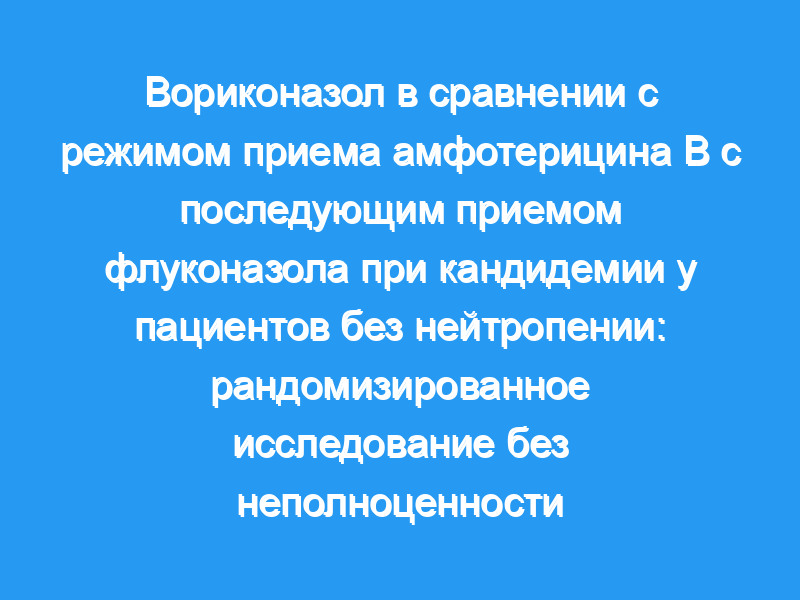 В исследование были включены пациенты без нейтропении с положительным посевом крови на вид candida и клиническими признаками инфекции. Пациенты были рандомизированы в соотношении 2:1 на вориконазол (n=283) или амфотерицин В с последующим назначением флуконазола (n=139). Первичный анализ эффективности был основан на клиническом и микологическом ответе через 12 недель после окончания лечения, оцененном независимым комитетом по анализу данных, не осведомленным о назначении лечения. Результаты: Из 422 рандомизированных пациентов 370 были включены в модифицированную популяцию с намерением лечить. Вориконазол не уступал амфотерицину В/флуконазолу в первичном анализе эффективности, с успешными исходами у 41% пациентов в обеих группах лечения (95% ДИ для разницы -10,6% до 10,6%). При последней оценке исход был успешным у 162 (65%) пациентов, которым был назначен вориконазол, и у 87 (71%) пациентов, которым был назначен амфотерицин В/флуконазол (р=0,25). Вориконазол очищал посевы крови так же быстро, как амфотерицин В/флуконазол (среднее время до отрицательного посева крови 2,0 дня). Прекращение лечения из-за нежелательных явлений по всем причинам было более частым в группе вориконазола, хотя большинство прекращений лечения были вызваны событиями, не связанными с приемом лекарств, и было значительно меньше серьезных нежелательных явлений и случаев почечной токсичности, чем в группе амфотерицина В/флуконазола. Интерпретация: Вориконазол был столь же эффективен, как и схема приема амфотерицина В с последующим применением флуконазола при лечении кандидемии у пациентов без нейтропении, и с меньшим количеством токсических эффектов. Актуальность для практики: Существует несколько вариантов лечения кандидемии у пациентов без нейтропении, включая амфотерицин В, флуконазол, вориконазол и эхинокандины. Вориконазол можно назначать как в качестве начального внутривенного лечения, так и в качестве перорального понижающего средства.