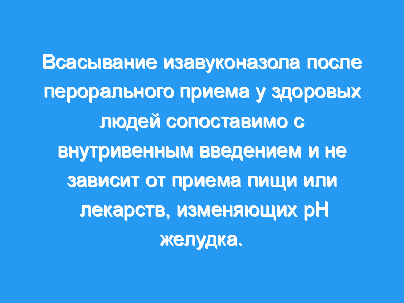 Цель/методы: Для определения абсолютной биодоступности активного триазола, изавуконазола, были проведены два открытых однократных рандомизированных перекрестных исследования и одно открытое многодозовое параллельное групповое исследование у здоровых добровольцев с использованием пролекарства, изавуконазония сульфата (EudraCT 2007-004949-15, n = 14)., и влияние пищи (EudraCT 2007- 004940-63, n = 26) и pH (NCT02128893, n = 24) на абсорбцию изавуконазола. Изавуконазония сульфат 744 мг, предназначенный для доставки 400 мг активного триазола, изавуконазол вводили в исследованиях абсолютной биодоступности (перорально или внутривенно (в/в) (2-часовая инфузия)) и пищевого эффекта (перорально). В исследовании pH-эффекта сульфат изавуконазония в дозе 372 мг, предназначенный для доставки 200 мг изавуконазола, вводили перорально три раза в день (т.е. внутривенно) в течение 2 дней, с последующей однократной ежедневной пероральной дозой в течение 3 дней в присутствии эзомепразола в стационарном состоянии в дозе 40 мг/день.