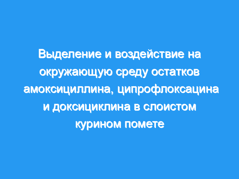 Показатели экскреции и экологический риск для окружающей среды трех широко используемых ветеринарных антибиотиков (ВАШ), амоксициллина, ципрофлоксацина и доксициклина, в навозе кур-несушек в периоды применения и отмены были исследованы в исследовании, состоящем из контрольной группы, получавшей базальный рацион без ВА, и девяти групп лечения состоял из трех уровней (200 мг/кг, 100 мг/кг и 50 мг/кг) амоксициллина (AMX), ципрофлоксацина (CIP) или доксициклина (DOC). Каждая группа лечения была воспроизведена семь раз с тремя курами-несушками на репликацию.