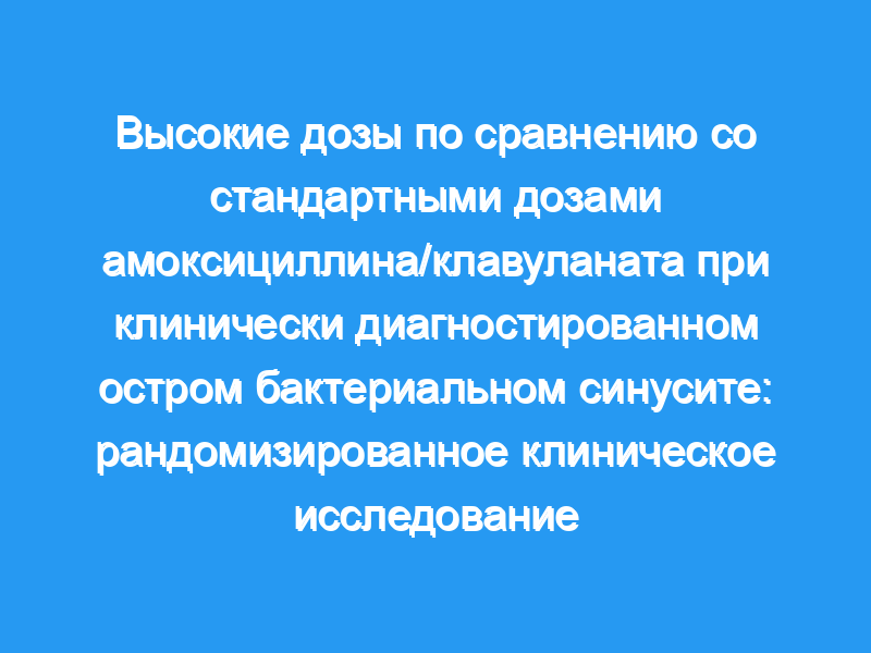 Чтобы увидеть, приведет ли более высокая доза амоксициллина к более быстрому улучшению. Дизайн, условия и участники: Двойное слепое рандомизированное исследование, в котором с ноября 2014 года по февраль 2017 года мы включили 315 взрослых амбулаторных пациентов с диагнозом острый синусит в соответствии с рекомендациями Американского общества инфекционистов. Вмешательства: Стандартная доза (SD) амоксициллина/клавуланата с немедленным высвобождением (IR) 875/125 мг (n = 159) по сравнению с высокой дозой (HD) (n = 156). Оригинальный препарат HD, 2000 мг амоксициллина пролонгированного действия (ER) с 125 мг IR клавуланата два раза в день, стал недоступен на полпути исследования. Затем IRB одобрил пересмотренный протокол после того, как пациент 180 назначил 1750 мг амоксициллина IR два раза в день в составе HD и сравнил Период времени 1 (ER) с Периодом времени 2 (IR). Основной показатель: Первичным результатом был процент в каждой группе, сообщивших о значительном улучшении — определяемом как глобальная оценка симптомов синусита как «намного лучше» или «никаких симптомов» — после 3 дней лечения. Основные результаты: Значительное улучшение через 3 дня было отмечено в течение периода 1 у 38,8% пациентов с ЭР ГД по сравнению с 37,9% пациентов с СД (Р = 0,91), а в течение периода 2 у 52,4% пациентов с ИР ГД по сравнению с 34,4% пациентов с СД, величина эффекта составила 18% (95% ДИ 0,75 — 35%, Р = 0,04). На 10-й день не было отмечено существенных различий в эффективности. Основной побочный эффект, тяжелая диарея на 3-й день, отмечался в течение периода 1 у 7,4% пациентов с ГД и 5,7% пациентов с СД (Р = 0,66), а в течение периода 2 — у 15,8% пациентов с ГД и 4,8% пациентов с СД (Р = 0,048).