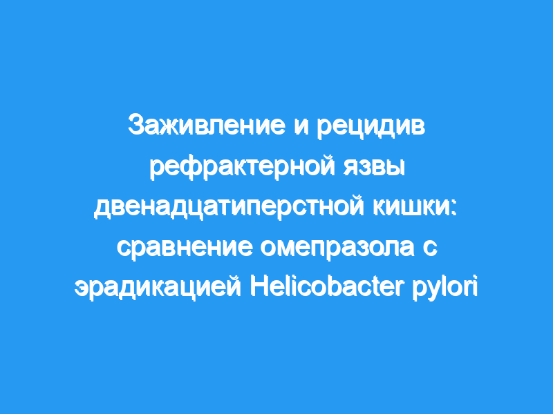 Изучить различия между омепразолом и эрадикацией Helicobacter pylori у пациентов с язвами двенадцатиперстной кишки, рефрактерными к антагонистам Н2-рецепторов, и сравнить частоту рецидивов после двух методов лечения. Дизайн и методы: Сорок пять пациентов с эндоскопически подтвержденной язвой двенадцатиперстной кишки, рефрактерной к антагонистам Н2-рецепторов, и инфекцией H. pylori были рандомизированы на 8 недель лечения омепразолом в дозе 40 мг/сут или 4 недели лечения коллоидным субцитратом висмута в дозе 480 мг/сут плюс метронидазол 750 мг/сут и тетрациклин 1000 мг/день с 1-го по 14-й день. Пациенты были обследованы эндоскопически и клинически в конце лечения. Пациенты с зажившими язвами наблюдались в течение 1 года после прекращения лечения. Эндоскопия была проведена через 3 и 12 месяцев.